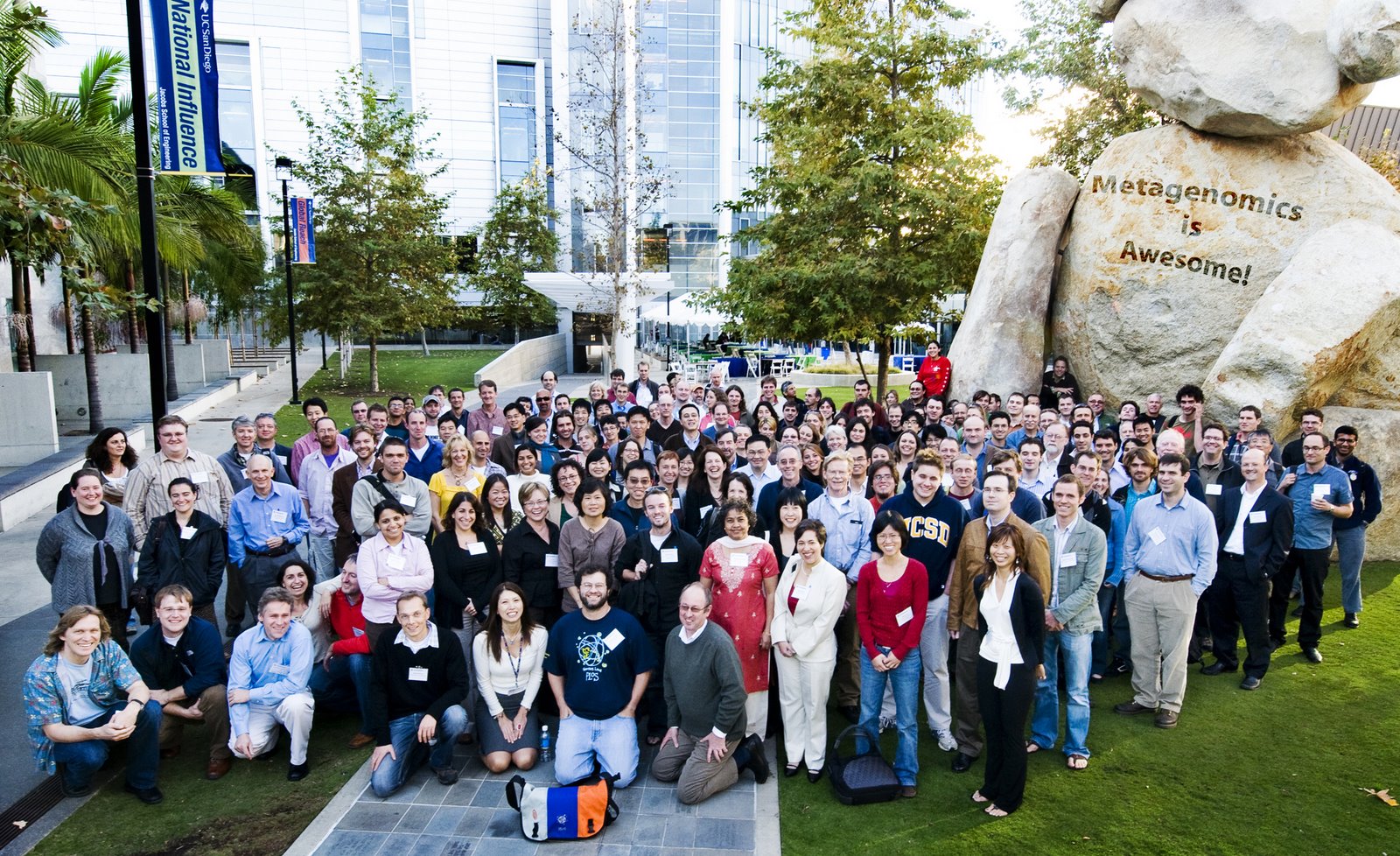 I may see PLoS even when it is not there, but in this picture, which was the group photo for the Metagenomics 2008 meeting at CalIT2, I weaseled my way to the front hoping to get my PLoS bag and PLoS shirt into the picture. And looky there – it worked.