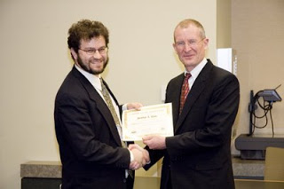 And what have I to say today?  Not much but here is a preview of things to come.  I have a feeling that Obama is stalking me scientifically.  Why?  Well, I am one or two steps removed from a huge number of his appointees and I plan to write about them in the next few weeks once I get better.  One things the science bloggers might not have heard about is the passion Adm. Dennis Blair has for science.  Dennis Blair is Obama’s pick for DNI (Director of National Intelligence) and I know him through a program called the Defense Science Studies Group (DSSG).  I will write more about this later, but what I can say here is I think Blair is a brilliant pick by Obama.  Not only does he have a strong military and intelligence background, but more importantly to me, he believes in evidence, and is a strong supporter of science.  And below is a little pic of me getting my certificate from Adm. Blair.