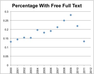 In some ways, there is good news here. The percentage of free text papers goes up over time from 2000-2009. But there is much bad news too. First – even in the best year, more than 70% of papers are not freely available. But perhaps more disconcerting, the percentage of freely available papers drops in 2010 and 2011. Why is this? I think most likely it comes from the delays in deposition to Pubmed Central that happen at many journals. So, it is good that some material gets out there, and apparently a higher fraction is getting out over time. But there is a big delay in the release of much of this material and the max percentage is still low. That is really unfortunate as the best way to catalyze scientific discovery to me is via rapid, open sharing. Imagine, for example, if Twitter posts were only available after 6 months. Useful? I don’t think so. What about weather information? Wait six months for a forecast? Sure, some aspects of scientific research do not need any input from others. But if papers are not important, then, why do we all fuss over them so much? That is because they contain knowledge, techniques, data, ideas, theories, and more. And it would be really better for all if everyone could have access to the full text of all such papers immediately.