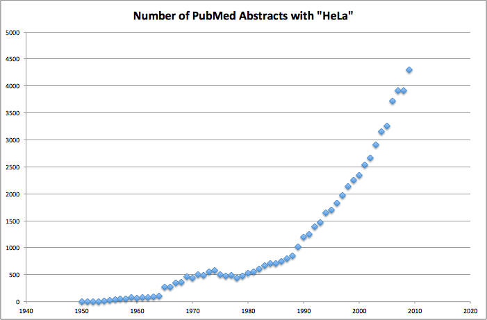 Anyway – I somehow managed to get her to come to UC Davis to give a talk last year just as the book was going viral. In preparation for Skloot’s visit I decided to do some sort of “open access” schtick and looked into how many papers about HeLa cells were in Pubmed Central. Pubmed Central is a database of papers for which the full text is available at no charge. After this mini-research and after interacting with Rebecca over the last year and seeing the well deserved recognition of her book, I have been a bit fascinated about how much of the literature surrounding studies of HeLa cells is openly and/or freely available.
