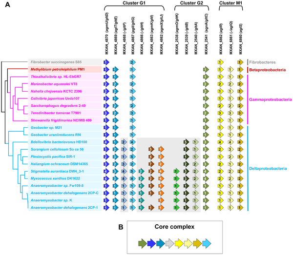 Figure 2. Taxonomic distribution of the closest homologues of the 14 genes composing the G1, G2, and M1 clusters, and genetic organization of the core complex. (A) For a given gene, the number of homologues in the corresponding genome is indicated by the numbers within arrows. The relationships between the species carrying the different homologues of the genes are indicated by the phylogeny on the left. Based on their taxonomic distribution, the 14 genes can be divided into Group A (grey background) and Group B (white background). (B) In all non Deltaproteobacteria and in Geobacter, the Group B genes clustered in a single genomic region.  doi:10.1371/journal.pgen.1002268.g002