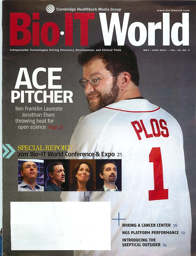 OK I now officially love BioITWorld; on the cover, in my #Redsox #PLoS1 shirt, called “Ace Pitcher”
