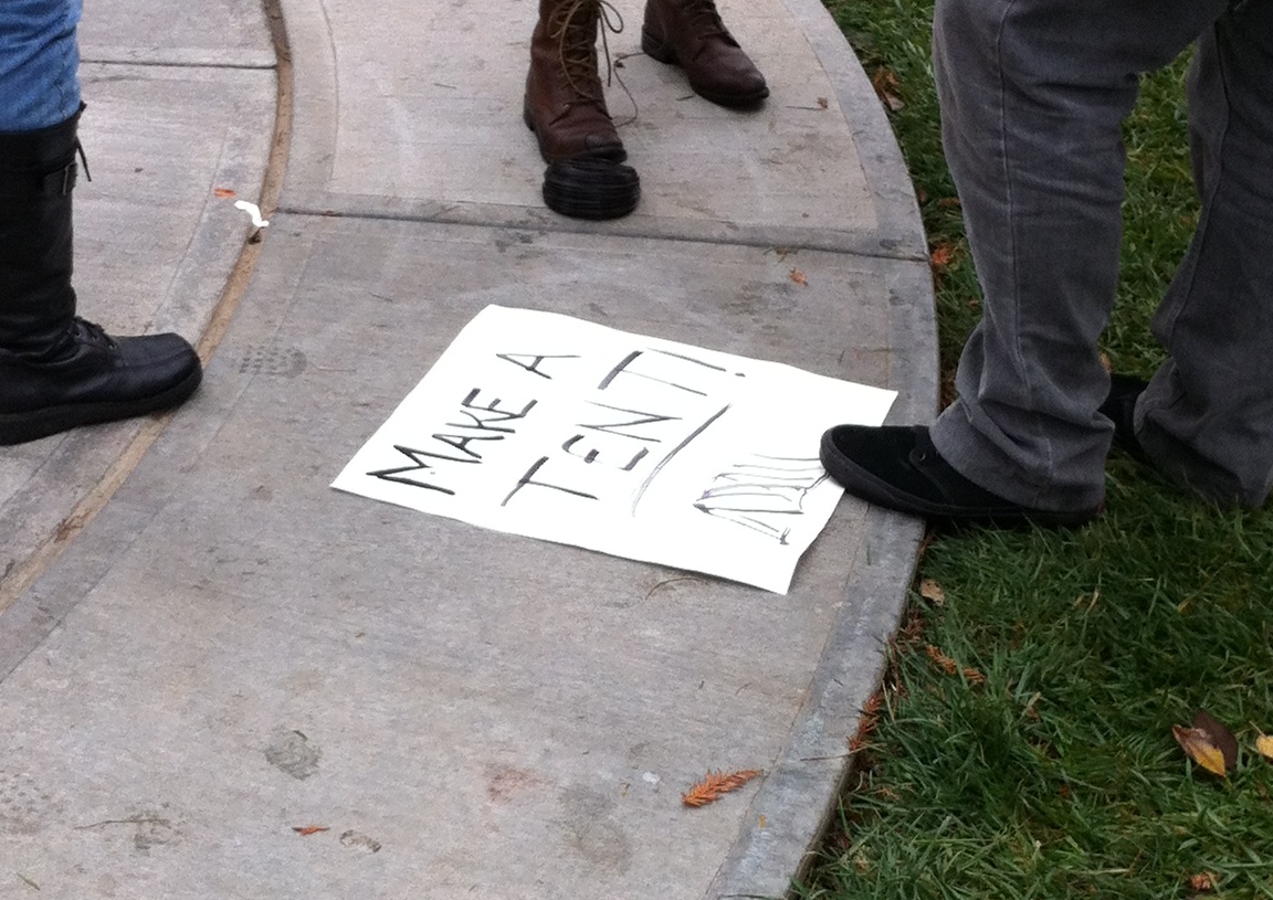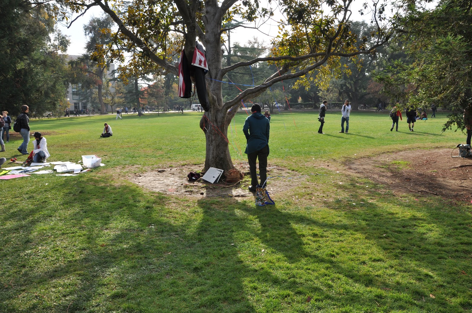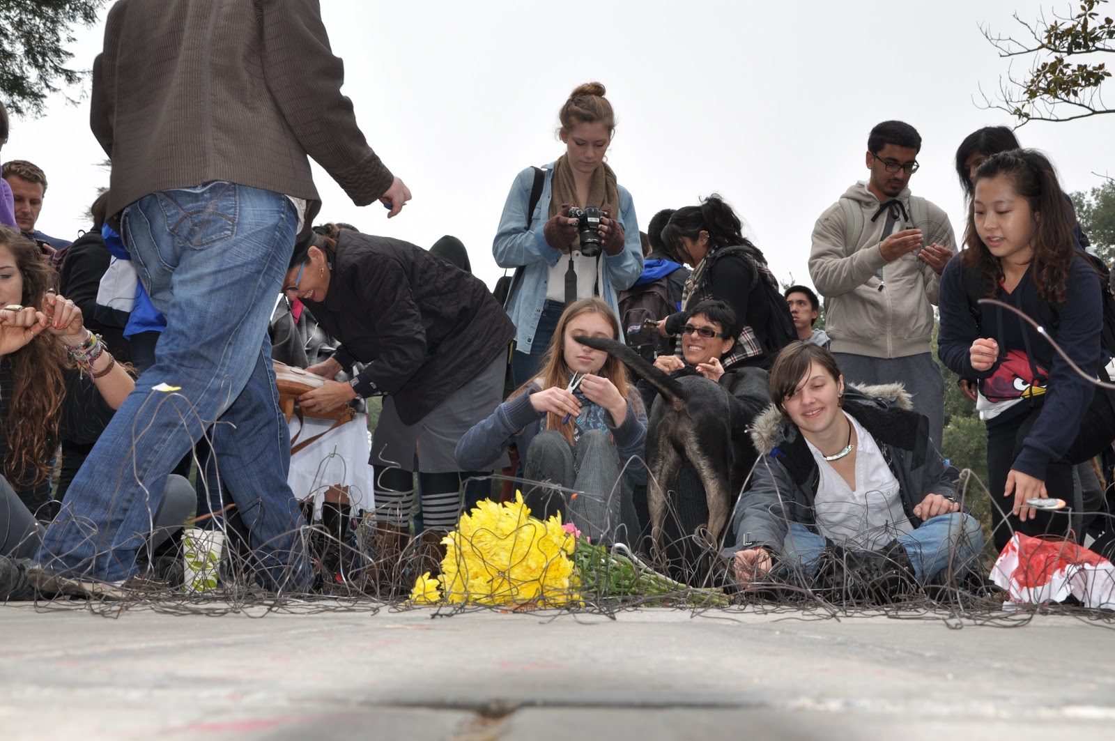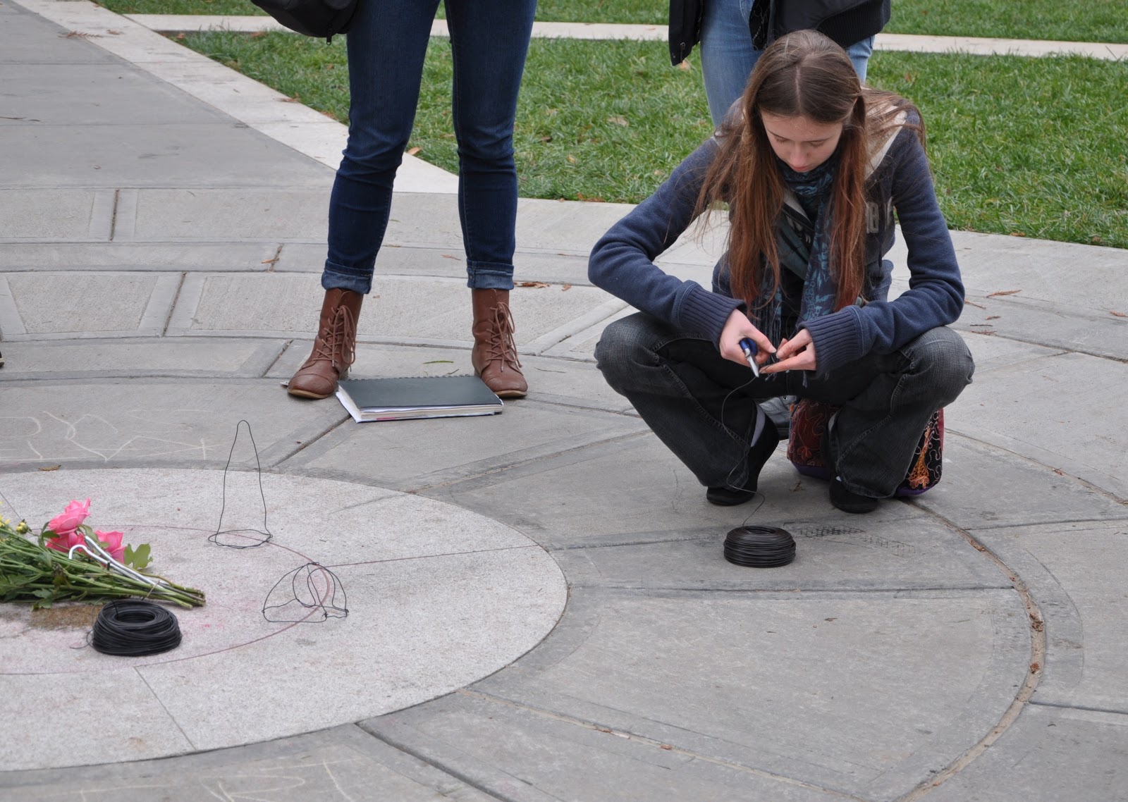 I then discovered a group gathering around the circle where the flowers had been placed as a “memorial” to the pepper spraying incident. The group it turns out was partly associated with a course at UC Davis that had ventured outside for class that day. The class was some sort of art course and the professor was talking to the students. Then they broke out some wire and wire cutters and started making mini tents to set up in the circle. I lingered there for a while and took a lot of pics (as I note, so did lots of photographers).