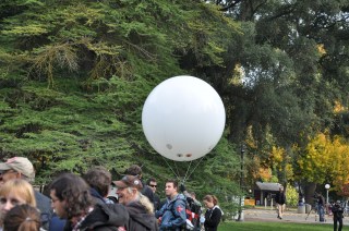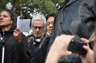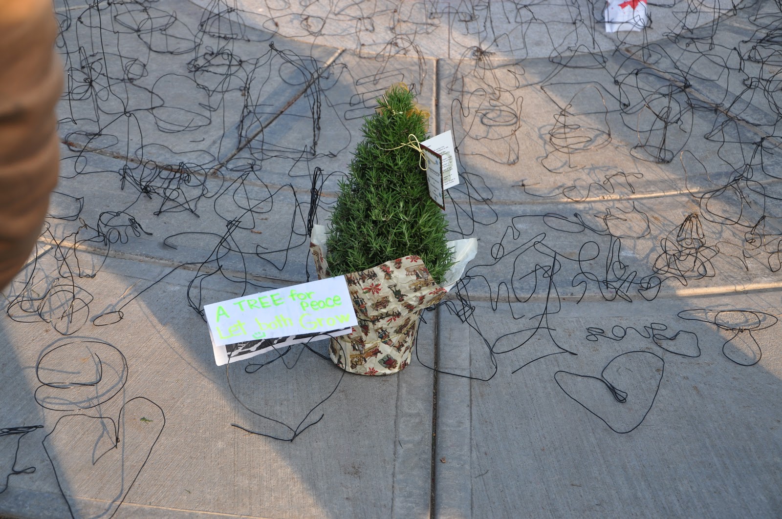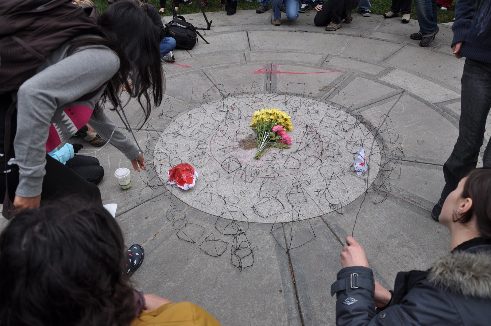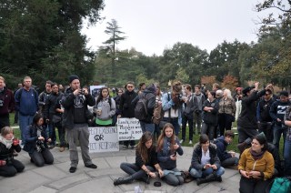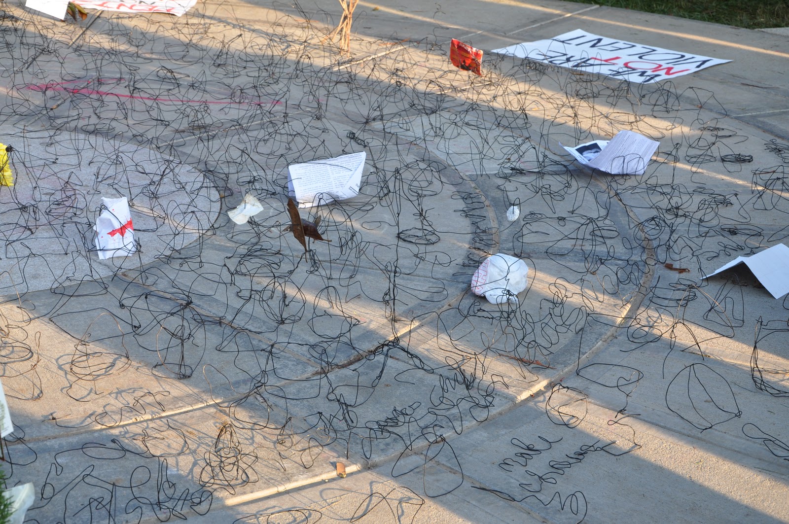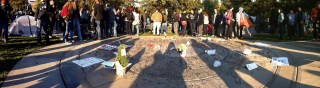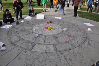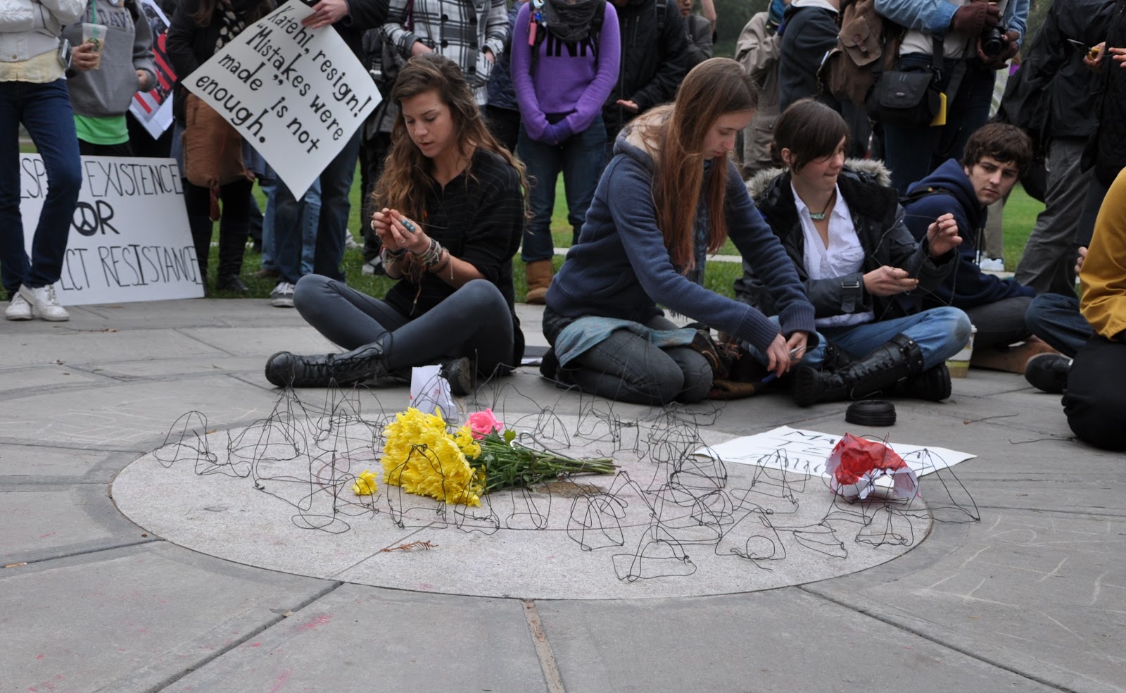 I then discovered a group gathering around the circle where the flowers had been placed as a “memorial” to the pepper spraying incident. The group it turns out was partly associated with a course at UC Davis that had ventured outside for class that day. The class was some sort of art course and the professor was talking to the students. Then they broke out some wire and wire cutters and started making mini tents to set up in the circle. I lingered there for a while and took a lot of pics (as I note, so did lots of photographers).