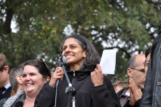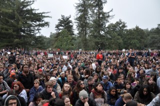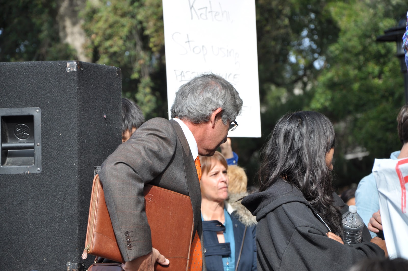 The crowd at this point was very very big and pretty loud (and I note – I seemed to know many of them – kept bumping into current and past students). And many of the speakers seemed a bit overwhelmed when they got up to the stage to see all the people there. I note – there were some very anti-Katehi talks during this part. The most passionate was Nathan Brown who had been rallying the anti-Katehi movement for the last few days. His talk was very very passionate. And he even went so far as to propose that police should be removed completely from UC campuses. He did not convince me on that point, but his points about the failures of the UC administration were hard to ignore. And his rhetoric was, well, very skilled. Here is a link to a video of his talk.
