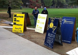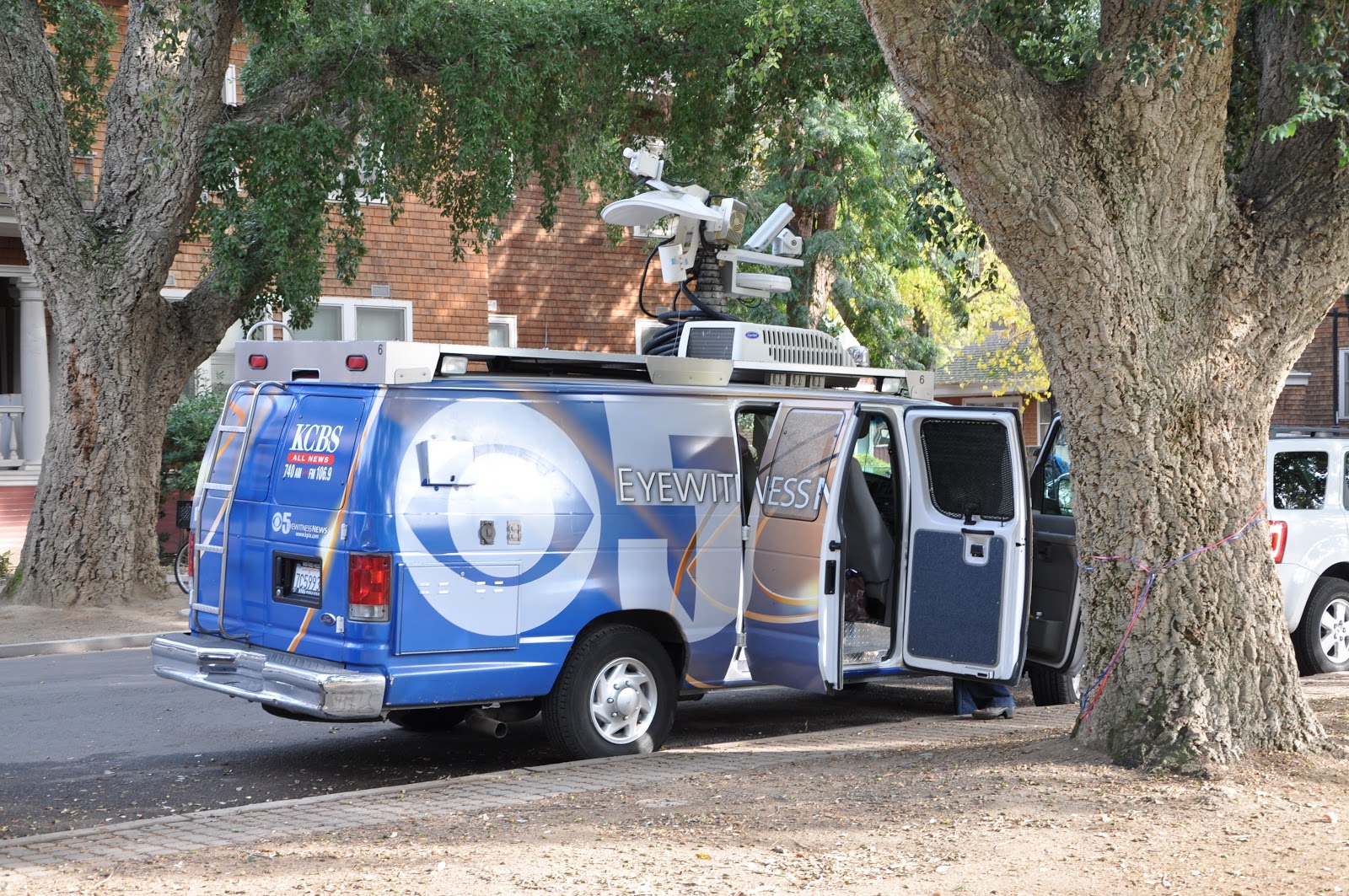 Anyway, I planned to head on over to hear my colleague lecture for our class at 3. I had about an hour to kill before then so I sat down by some of the TV trucks and tried to connect back to the web to post some pictures and notes. I got some soup, and sat down next to someone at a table by one of the TV trucks and logged on. Turns out the person I sat next to was from CBS13 and we talked on/off for a bit. And then their reporter Checkey Beckford sat down to eat her lunch too and we all talked for a bit about the pepper spraying incident and the UC Davis response. And I got caught up in all this. And then even when they left I continued to work on posting pictures, not realizing that our class had started. By the time I realized it was really too late to go.
