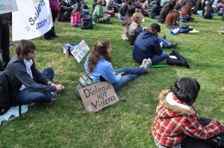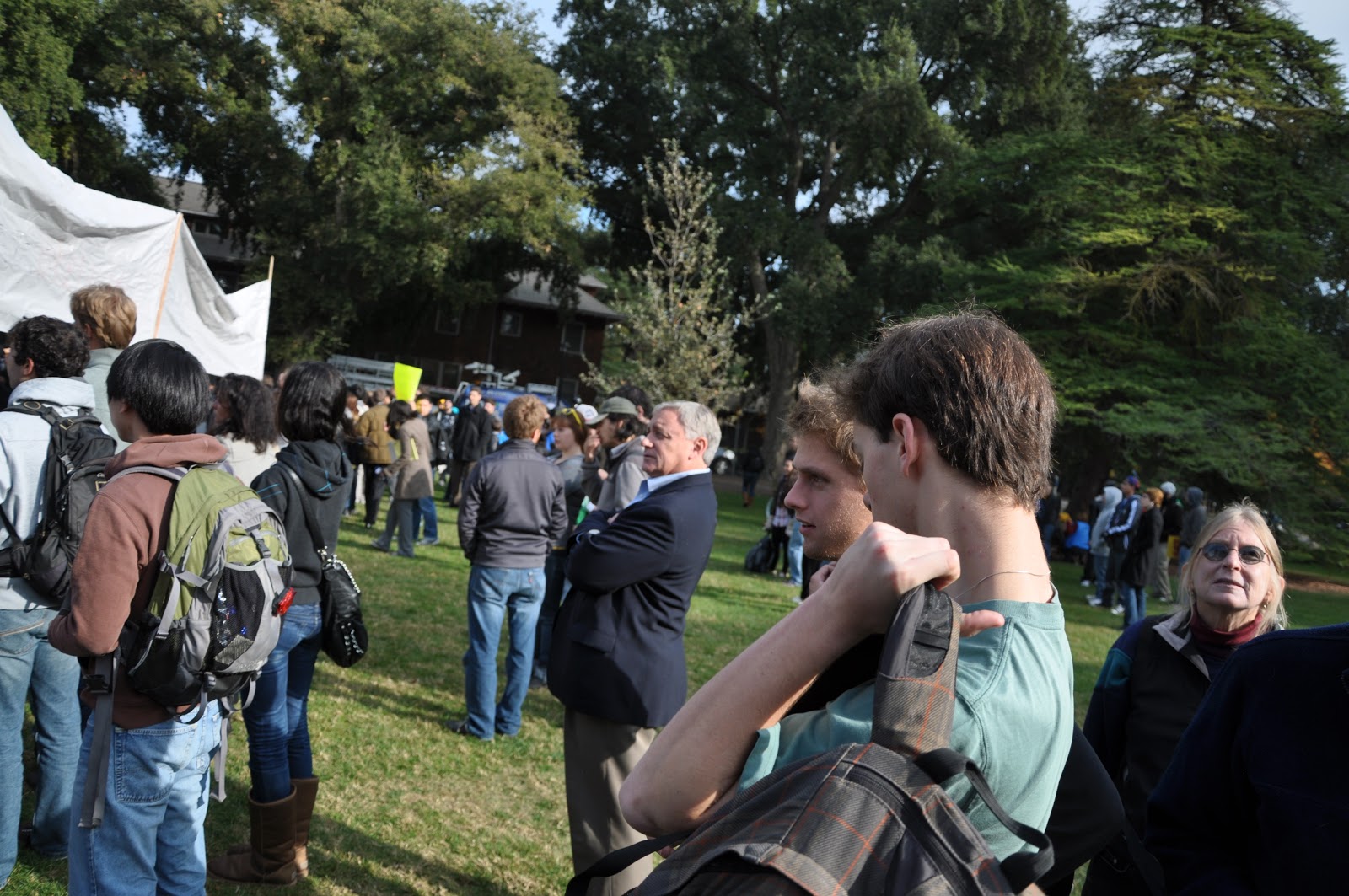 I have been consumed with this issue since Friday when the spraying of protestors happened in the “quad” at UC Davis. And I had been posting relentlessly to twitter and my blog and posterous and Facebook and, well, all over. I had no idea how this day was going to play out. Would Chancellor Katehi show up to the rally? Would she speak? What would other people say? Would the tents go up again? How many people would show up? Would it be peaceful (I assumed yes). Would there be any police around? And so on.