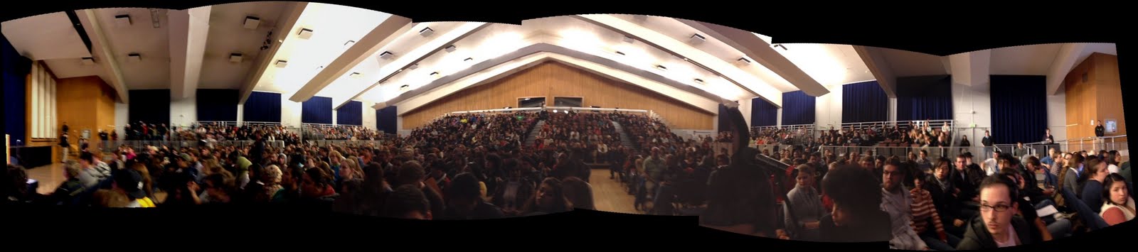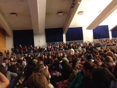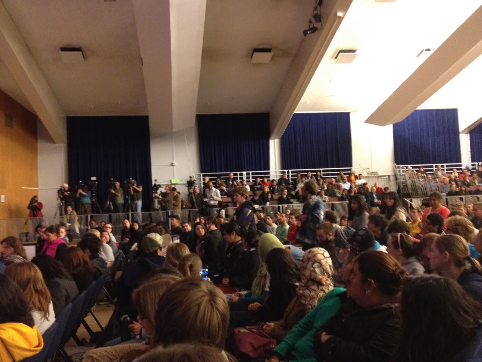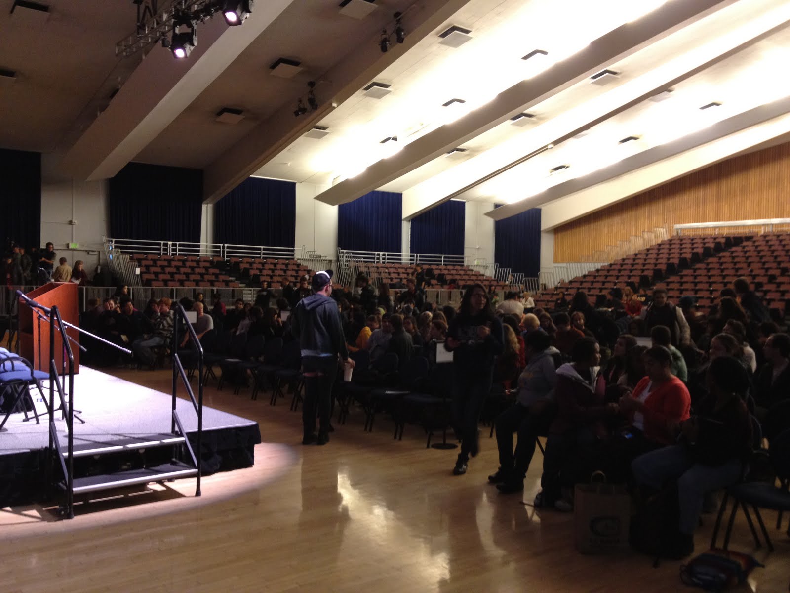 Well here is  quick post about the Town Hall meeting.  I went there at about 4:30 with one of the PhD students in my lab – Russell Neches.  We got to Freeborn and a line was forming outside.  Russell got in the line and I went to the front to make sure it was the right place to be.  I saw one of the students in my Intro Bio class and he said it was the right place to be.  So I then went inside to grab a drink and headed back to the line.  I then took a few pictures and and posted some comments on twitter.  I am intermixing my comments here with twitter posts and my pictures.  I note – I would use Storify for this but they make it hard to include pictures from picasa so I am going to have to do it this way.  I realized this post is a bit raw – but I am very tired and I need to try and get some other work done, so this is going to have to suffice for now.  I may try to enhance it with more text in a bit.