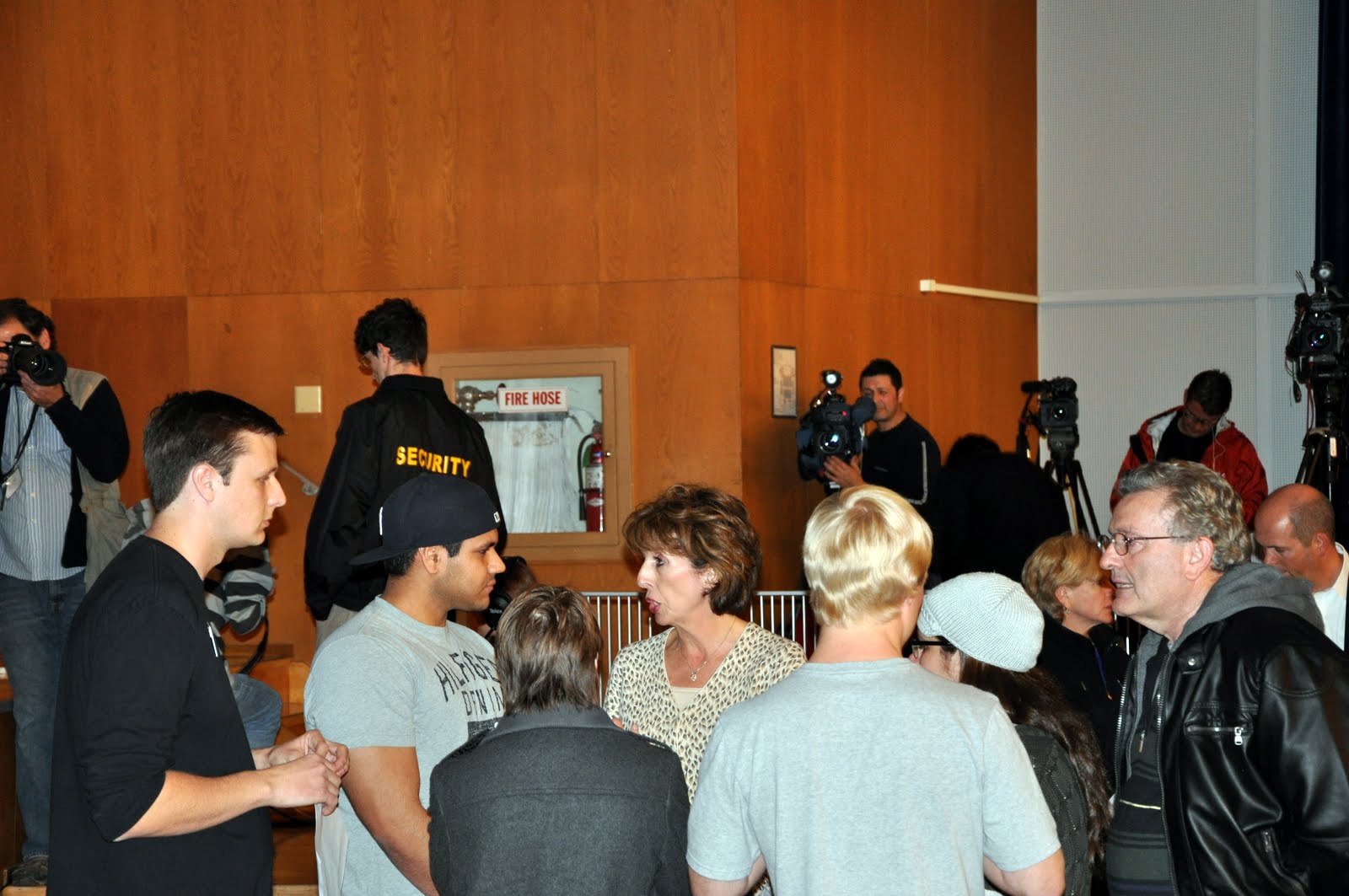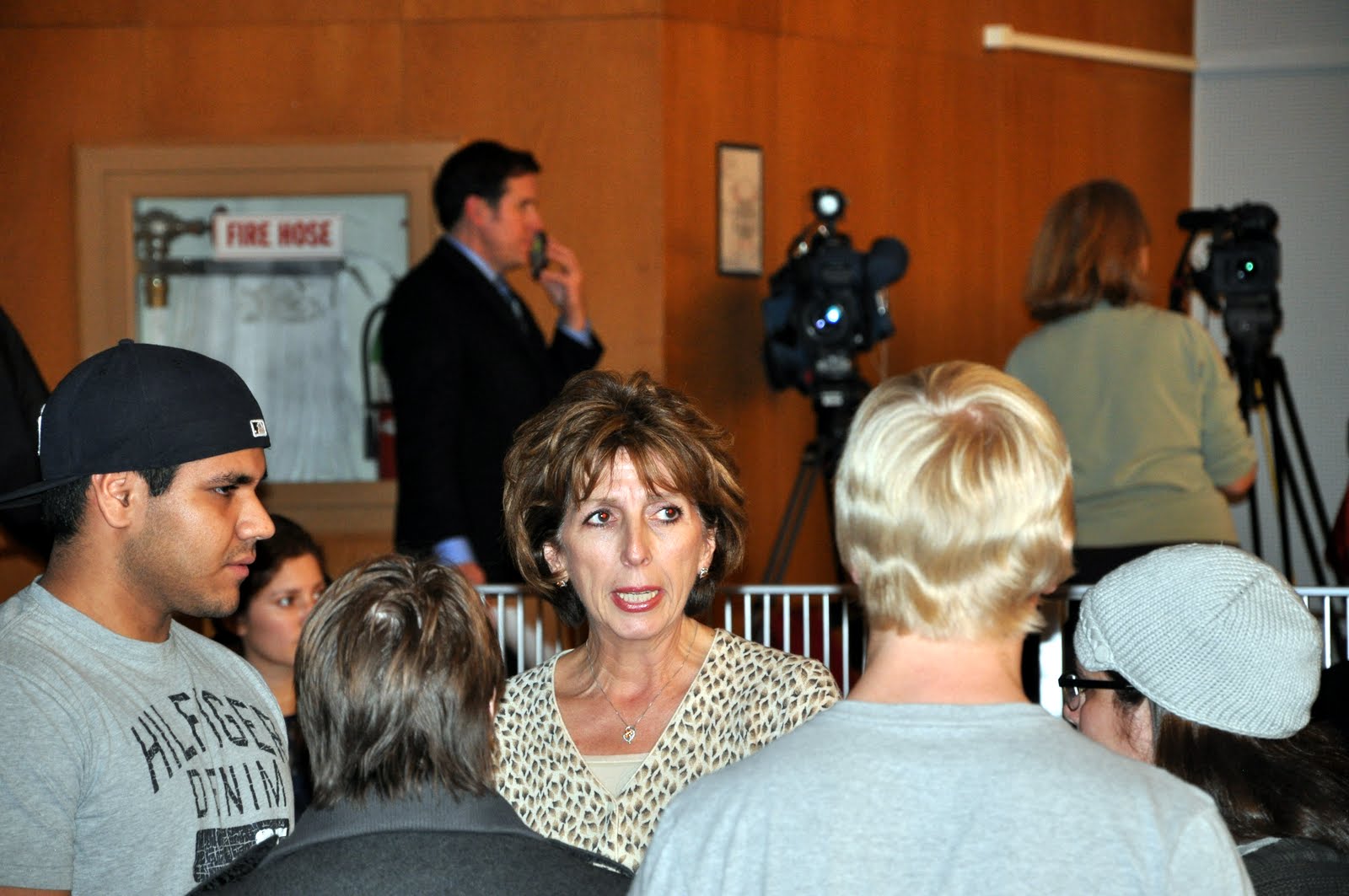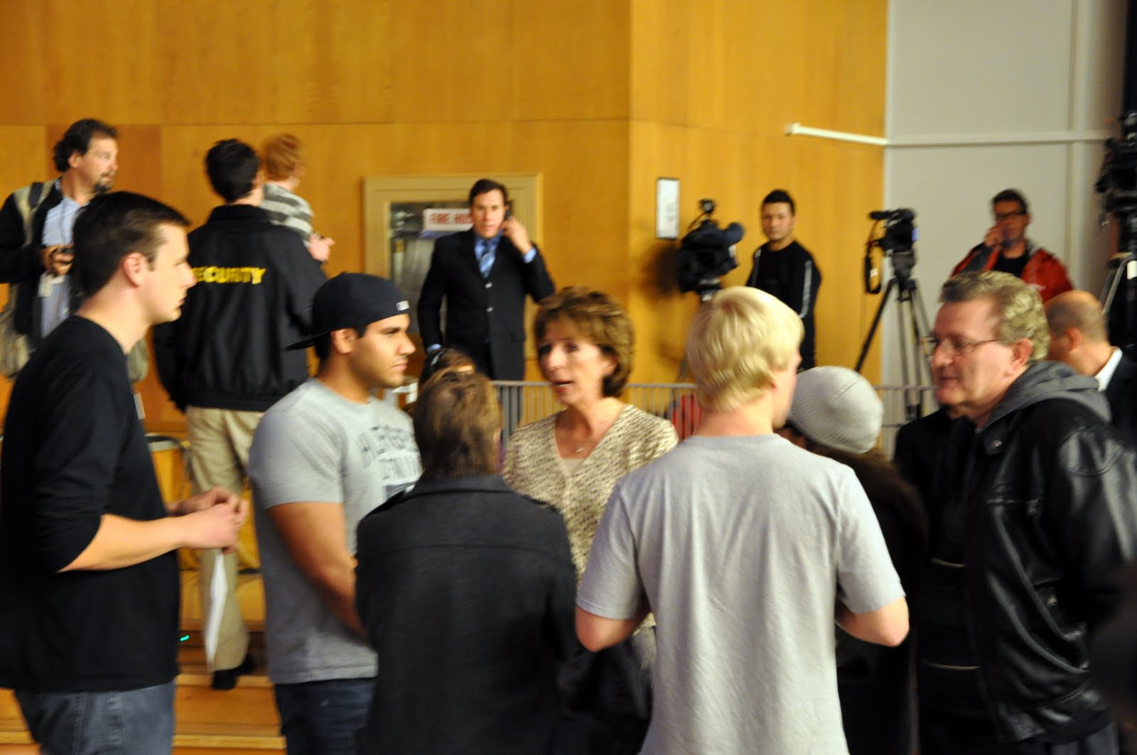 Then the UC Davis administrators started to arrive and eventually a bunch of people went up to talk to them.  I took a bunch of pics of the scene – it was very friendly I note – no yelling at anyone.  No chanting for resignation.  Just chatting with Katehi and others.