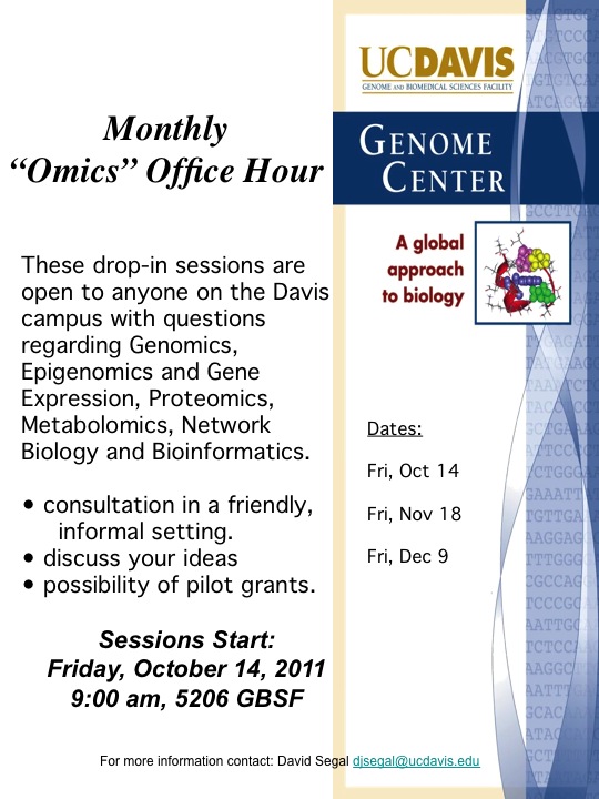 The UC Davis Genome Center will be holding an Omics Office Hour from 9:00-10:00am each month in Room 5206 GBSF on the Davis campus. These drop-in sessions are open to anyone with questions regarding Genomics, Epigenomics and Gene Expression, Proteomics, Metabolomics, Network Biology and Bioinformatics.
