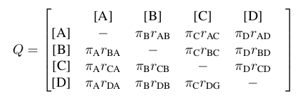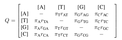 General Time Reversible Model it is the most generalized model describing the rates at which one nucleotide replaces another. If we want to know the rate at which a thymine turns into a guanine, we look at elment (2,3) of this matrix :