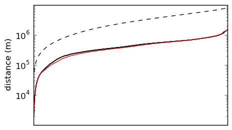 The spectrum of pairwise distances among all sites in the USGS databse (solid black), among randomly placed sites over the same geographic area (dashed black), and among random sub-sample of 360 sites from the database (solid red).