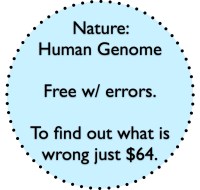 But I have discovered a just painful though funny absurdity with NPG’s money making machine. They have in fact made the Lander et al. Human genome paper from 2001 freely available. But there is an Erratum to this paper. And if you want to get it (and without getting it there is no way to know what is being corrected), you have to pay $32: Access : erratum: Initial sequencing and analysis of the human genome : Nature. Oh, and in addition a Correction “We have identified several items requiring correction or clarification in our paper on the sequencing of the human genome” for this paper also costs $32. So the incorrect version of the paper is free but the corrections will cost you $64.
