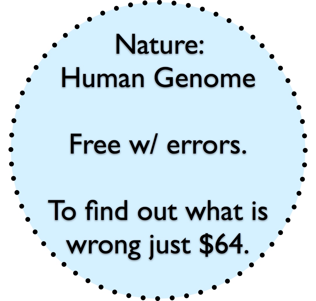 But I have discovered a just painful though funny absurdity with NPG’s money making machine. They have in fact made the Lander et al. Human genome paper from 2001 freely available. But there is an Erratum to this paper. And if you want to get it (and without getting it there is no way to know what is being corrected), you have to pay $32: Access : erratum: Initial sequencing and analysis of the human genome : Nature. Oh, and in addition a Correction “We have identified several items requiring correction or clarification in our paper on the sequencing of the human genome” for this paper also costs $32. So the incorrect version of the paper is free but the corrections will cost you $64.