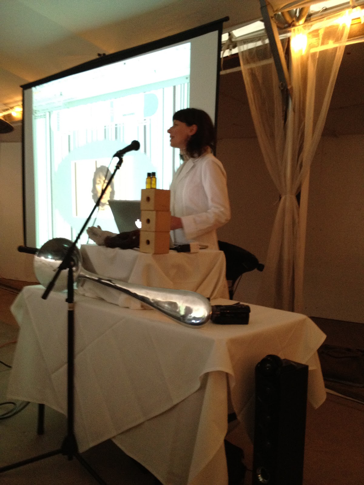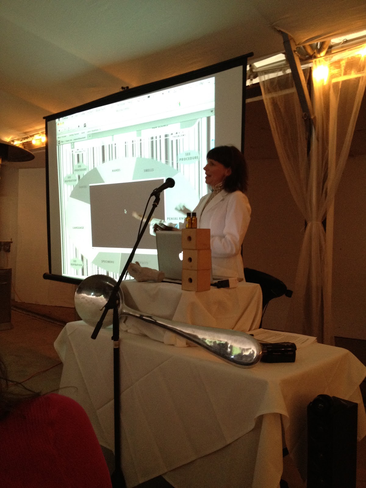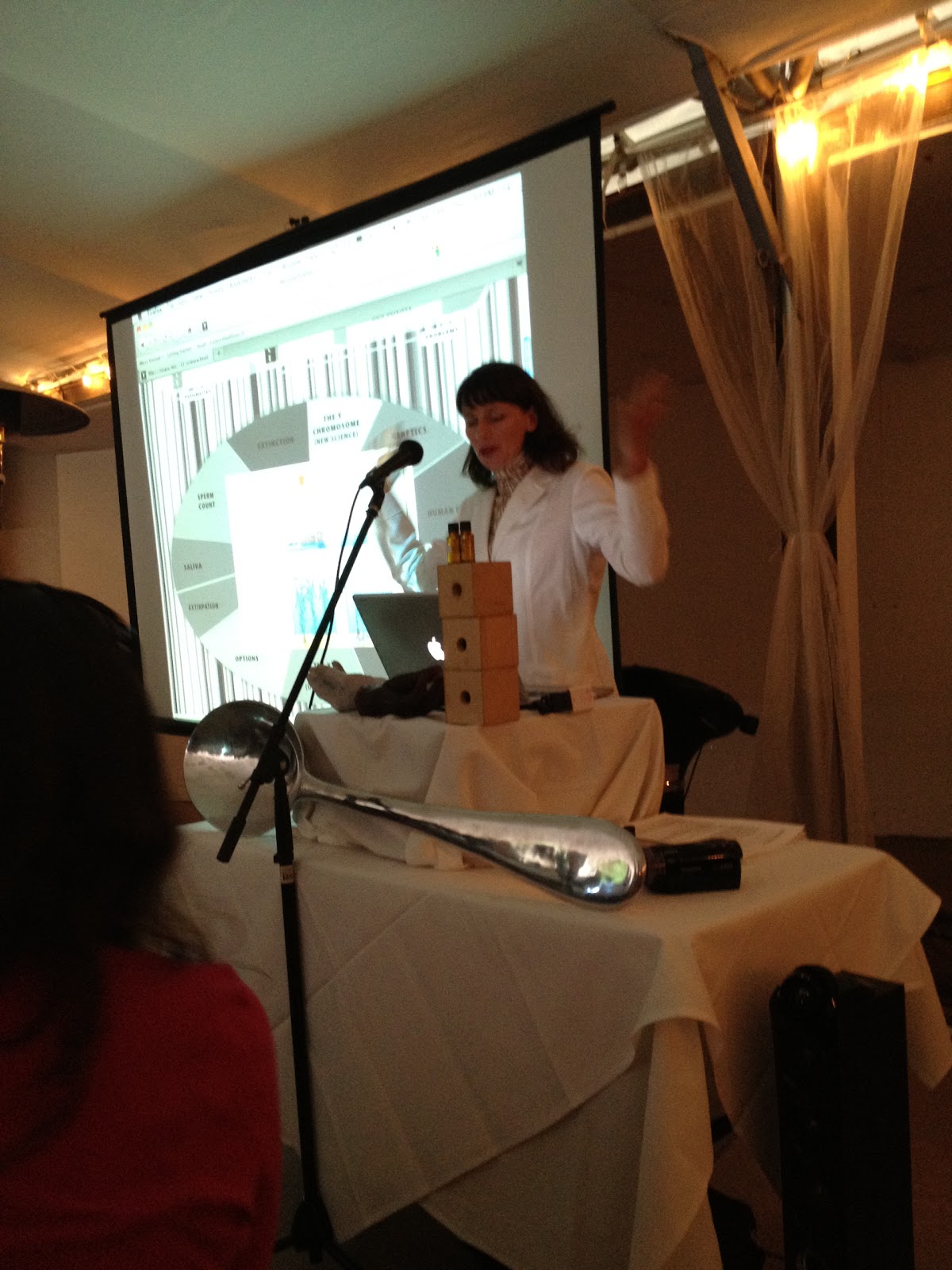 She also had some philosophical discussions of evolution and ecology including pondering the role of men in extinction crises and greenhouse gas emissions and whether men could be considered a “keystone species.”  It was a combination of geeky, absurd, sarcastic, genius, and outrageous.  There was even an extensive discussion of man dances and both recording them and reenacting them (the dances were amazing I note)  The funniest part (from my point of view) was the preservation of male artifacts including smells (which she cans like jam), socks (which she said sometimes she adds sugar to to preserve better), saliva, and more.  I note – she said she brought vials to collect some additional male artifacts from the meeting for her collection.  I think I was the only one who donated …