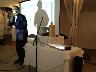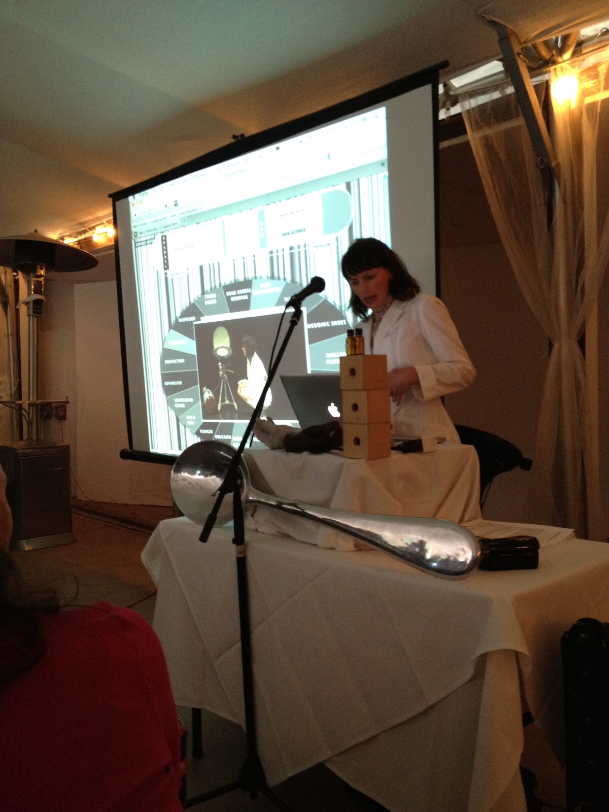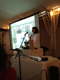 We had dinner at Red Lion Restaurant – a phenomenally gorgeous spot in the canyon just West of Boulder.  And while we were milling around before dinner I saw out of the corner of my eye a woman walking in to the tent where we were to have dinner.  She was dressed in almost all white and was carrying a giant silver spoon.  So I asked the meeting organizer – Mark Hernandez – if she was the entertainment.  And surprisingly he said – yes – she was a dancer and Professor at Boulder and also did a kind of science performance art.