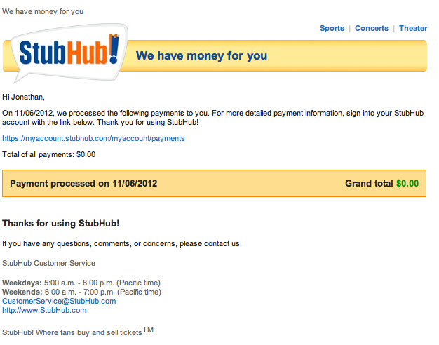 So I waited again. And waited. And then I got an email with the subject line “Payments Returned to StubHub – 11/06/2012.” Sounded good. Until I looked at the email.
