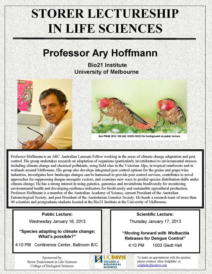 At #UCDavis: Ary Hoffmann-1/16-17th Climate change, Dengue, Wolbachia and more