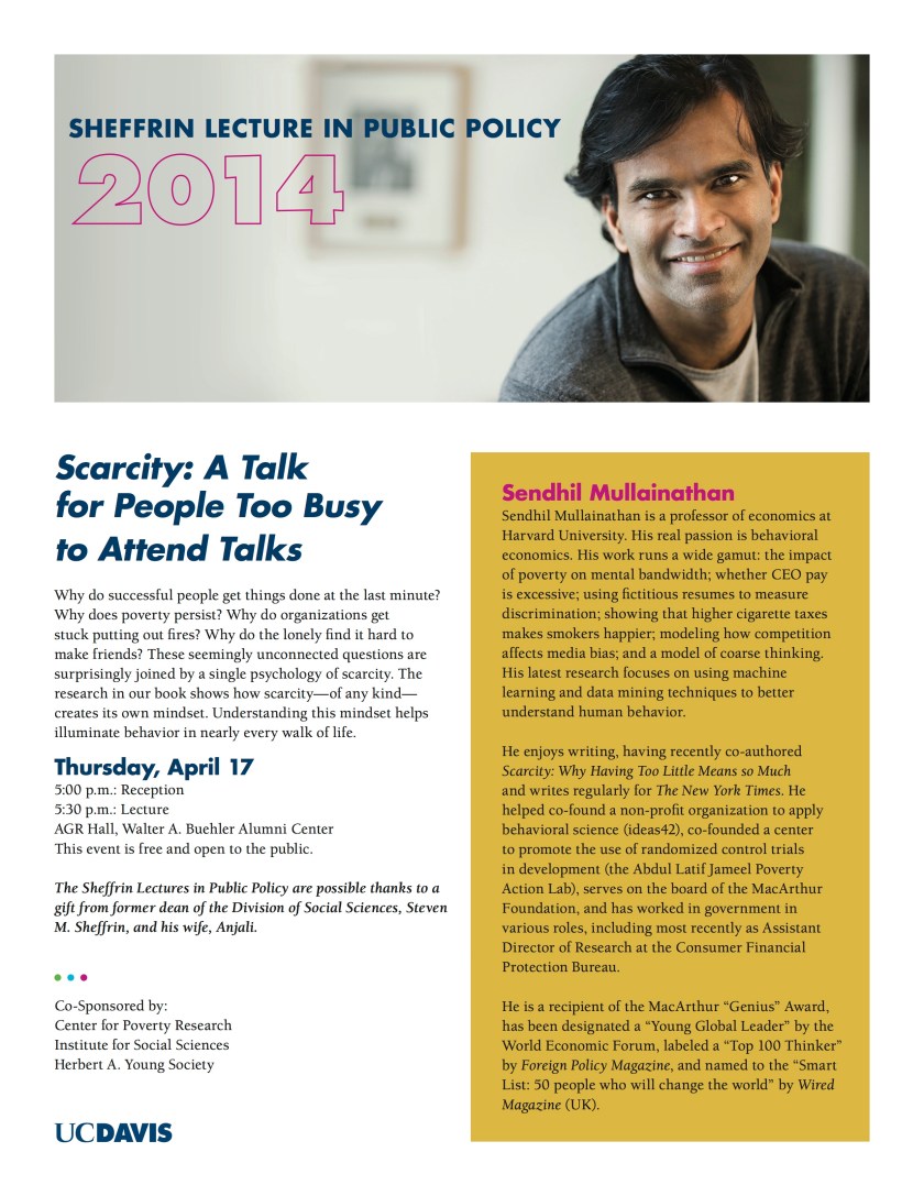 The annual Sheffrin Lecture in Public Policy (an annual Division of Social Sciences Event) will take place this Thursday, April 17th, 5:30 pm in the Alumni Center (AGR Room) and will feature Professor Sendhil Mullainathan from Harvard, talking about his recent book, Scarcity (co-authored with Princeton Psychologist Eldar Shafir).