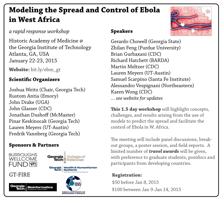 Please see attached for an image and pdf meeting flyer. The organizing committee includes Pinar Keskinocak and Fred Vannberg from Georgia Tech, as well as Rustom Antia (Emory), John Drake (UGA), Jonathan Dushoff (McMaster), John Glasser (CDC) and Lauren Meyers (UT-Austin).