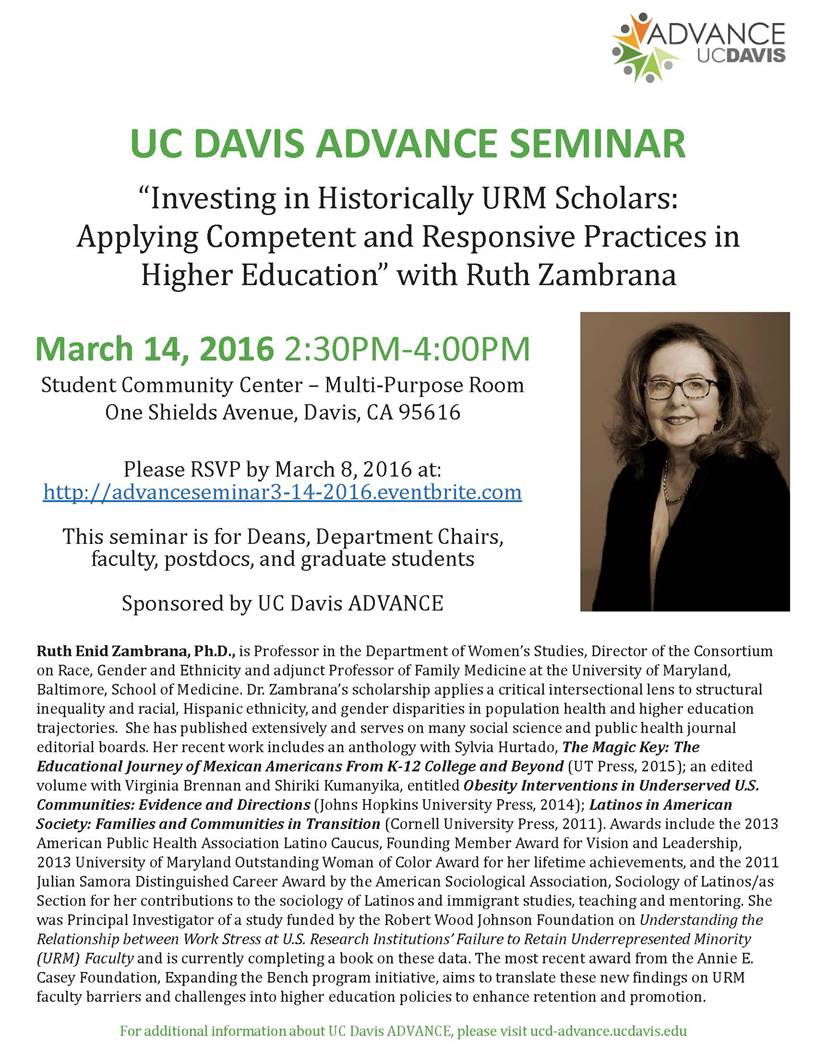 One thought on “3/14 at #UCDavis: Ruth Zambrana “Investing in Historically URM Scholars: Applying Competent and Responsive Practices in Higher Education””