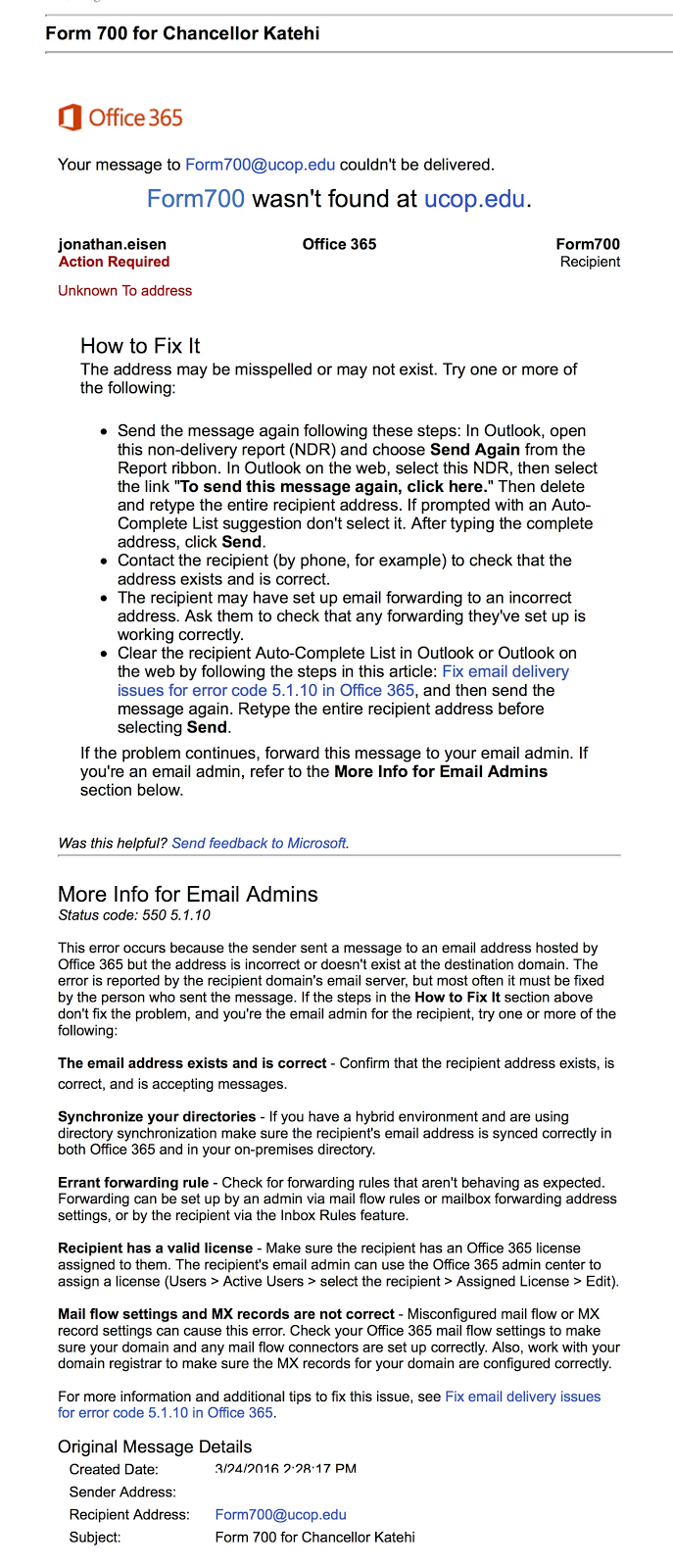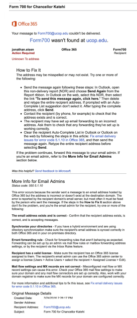 Dear Dr. Eisen, I believe the reason that your email bounced back is because it is incorrect. The correct email for your request is form700info@ucop.edu (copied above). The Office of the President is the “office of record” for all Form 700s. I would have to go through the same process as you do to acquire this information. Please feel free to contact me later next week if you still have not received a response from OP, but usually requests are responded to within a couple of business days. (FYI – tomorrow is a University holiday.) Regards,