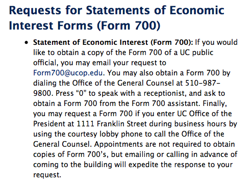 - Statement of Economic Interest (Form 700): If you would like to obtain a copy of the Form 700 of a UC public official, you may email your request to Form700@ucop.edu. You may also obtain a Form 700 by dialing the Office of the General Counsel at 510-987-9800. Press “0” to speak with a receptionist, and ask to obtain a Form 700 from the Form 700 assistant. Finally, you may request a Form 700 if you enter UC Office of the President at 1111 Franklin Street during business hours by using the courtesy lobby phone to call the Office of the General Counsel. Appointments are not required to obtain copies of Form 700’s, but emailing or calling in advance of coming to the building will expedite the response to your request.