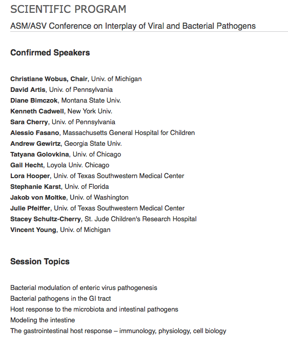 Just to spread the word, particularly for your trainees— there will be a new conference May 1-4, 2017 that is co-sponsored by ASM and ASV. It will cover many aspects of intestinal biology (see below).