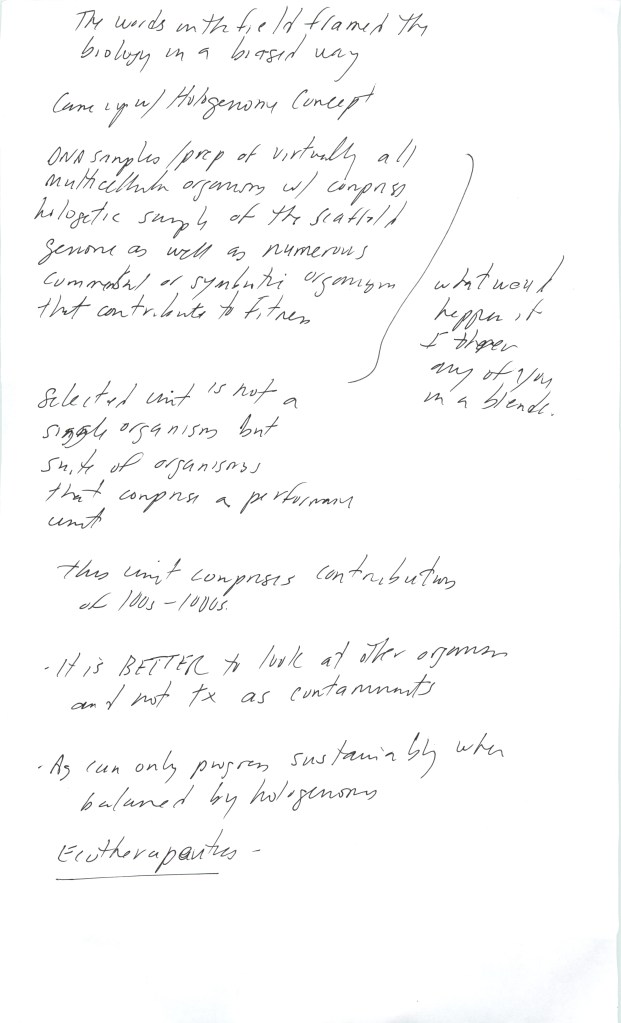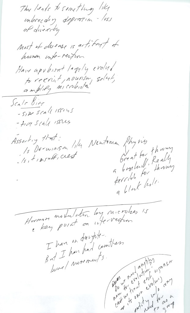 Did the advent of agriculture and the concomitant rise in sedentary and concentrated populations cause massive inbreeding depression of the microbiome and become the origin of disease – plant, animal and human – as dysbiosis? Is the germ theory of disease opportunistically right but structurally wrong? Did commensalism and community tactility/touching – the hallmarks of social behavior – cause harmonization and reinforce convergent microbial populations and thus congruent hormone action and hence behavior? Has all of evolutionary thought been compromised by scale bias? Is it reasonable that the logic of evolution is embedded in macro-organisms (e.g. anything we can see) rather than the vast majority of all living systems that we can’t? Is the holobiont – in the case of all systems that have experienced the post agricultural microbial collapse – really a merobiont, with at best metastable populations that do not reflect an empirical steady state? Is Darwin’s natural selection an ‘edge-case’ in evolution, working well at medium physical and temporal scales, but not truly reflecting the primacy of information-state persistence that could describe microbial life? Could the hologenome theory and the microbiome provide the missing mechanism to the late 19th century’s other great evolutionist – now largely forgotten – Pyotr Kropotkin, who proposed ‘Mutual Aid: a factor in evolution” in 1902? Could the real driver of evolution not be replication and reproduction, but persistence and pooing? Can the role of macro-apobionts be largely as dynamic scaffolds to recruit, select, nurture, amplify and disseminate microbial populations?