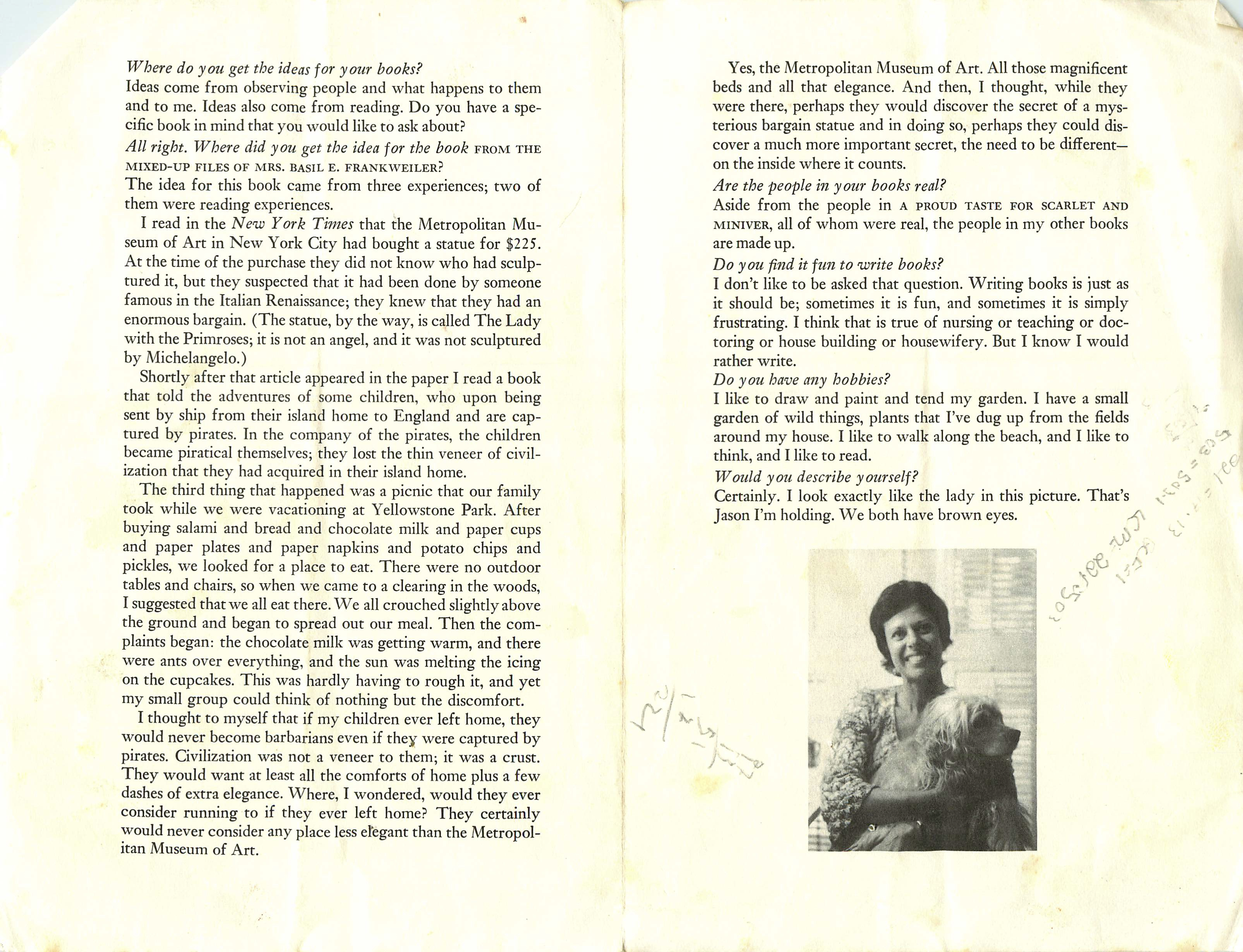 Sad to hear that EL Konigsburg died a few days ago. She was one of my favorite authors when I was a kid. Here is a note I kept from her that she wrote (when I was very young) after I had written her a letter about loving her books …ElKonigsburg