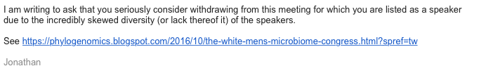 They wrote back with a very detailed response and were very supportive of the concept of increasing diversity of speakers. And they explained some of the efforts they had made in this regard. And they really seem to be trying in some ways. But in the end, their main justification for the lack of diversity was that they were trying to invite already recognized, in essence famous, biologists. People who had won a Nobel or were in the National Academy of Sciences or were HHMI investigators. And this pool, that they had chosen, was skewed in gender balance.