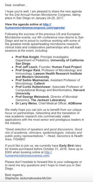 Most years I have been here, I have received a request from the organizers for suggested speakers and every once in a while I have made suggestions, some of which have even led to invitations. Recently, I had suggested a famous colleague who is also a UC Davis alum. Alas, she could not come. The organizers asked if I had any other suggestions and I sent them a list of a few candidates who are both very good, well known and do something related to microbes. The organizers really liked one of the suggestions and asked if I would be willing to invite this person.