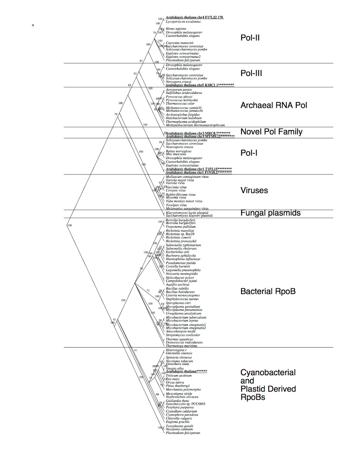 Figure. Phylogenetic tree of RNA polymerase homologs. Homologs of RNA polymerase were identified by searching sequence databases with representatives of the major known RNA polymerase subfamilies. These proteins, as well as six DNA polymerase homologs from A. thaliana, were aligned using clustalx using default settings. Phylogenetic trees were generated from the alignment (with ambiguously aligned regions and hypervariable regions excluded) using the PAUP* program. The tree shows was generated using the neighbor-joining algorithm with pairwise distances between sequences calculated with a PAM-like matrix. Numbers on the branches are bootstrap values indicating the percentage of 100 trees in which the proteins to the right of the node grouped together to the exclusion of all other proteins.