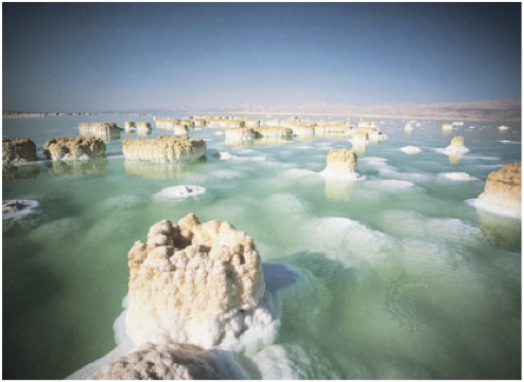 | This photograph shows salt pillars that form in the dead sea which borders Jordan to the east and Israel and the West Bank to the west. The salt concentration in the water can exceed 5M! |