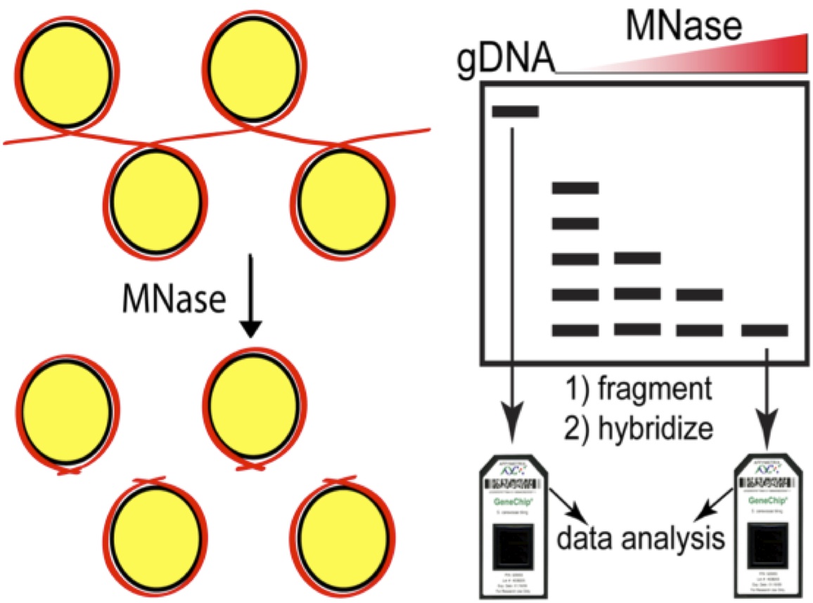 As a reminder, the micrococcal nuclease (MNase) assay relies on the preference of this nuclease to digest linker DNA. By chemically crosslinking histones to DNA with formaldehyde, digesting with MNase, then reversing the crosslinks and deproteinizing the DNA, you obtain 2 populations of DNAs, those protected by digestion (and presumably wrapped around nucleosomes in vivo) and a control sample that is crosslinked but not digested (genomic DNA). The former sample becomes the numerator and the latter the denominator and you take the ration between the two. Initially we compared the microarray signal intensities, now next generation sequence counts are used to define nucleosomal DNA. This cartoon depicts the array based assay, but simply swap in an NGS library step for the arrays to upgrade to the current state-of-the-art.