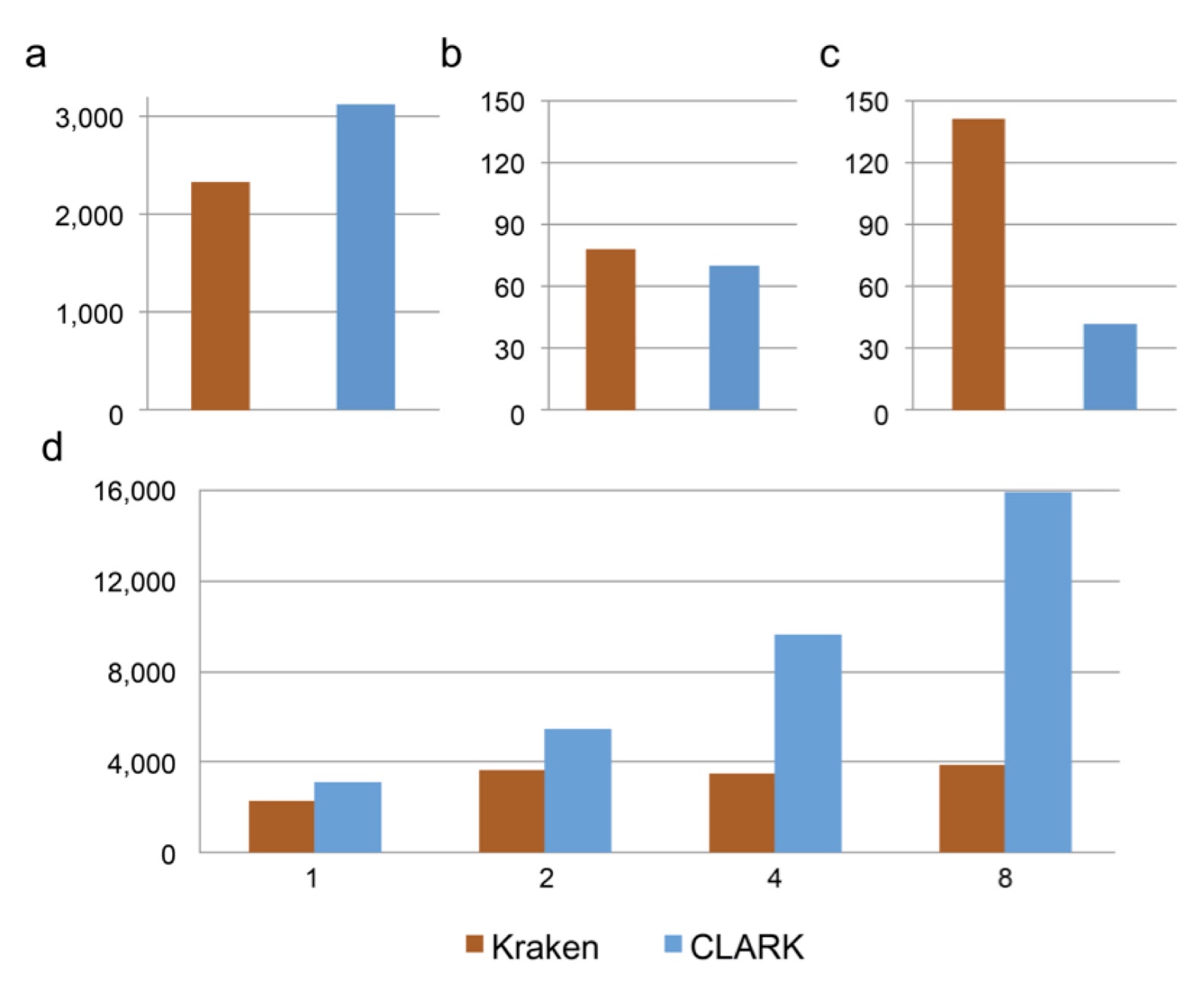 Performance of Kraken (v0.10.4-beta) and CLARK (v1.0) for the classification of a metagenome sample of 10,000 reads (average reads length 92bp).  a) The classification speed (in 103 reads per minute) in default mode. b) RAM usage (in GB) for the classification. c) Disk space (in GB) required for the database (bacterial genomes from NCBI/RefSeq). d) Classification speed (in 10^3 reads per minute) using 1, 2, 4 and 8 threads.