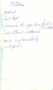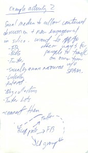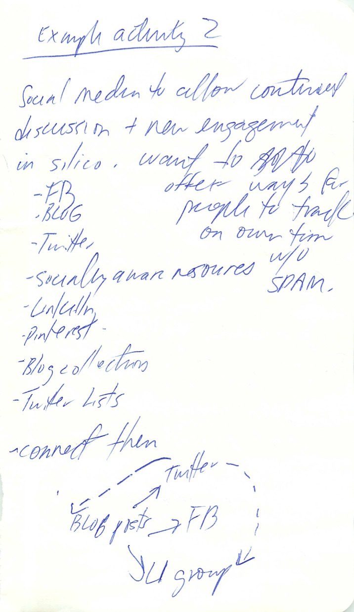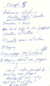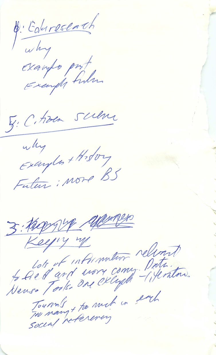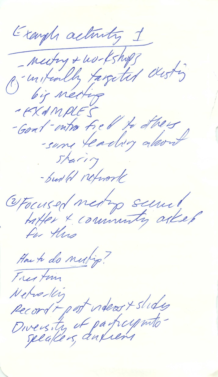 So now I had some idea as to what I might want to say on these topics. No slides yet, but some idea as to what I might want to cover. And then, still not back on the computer I thought it would be good to write out an outline / the flow of the talk again. So I did.