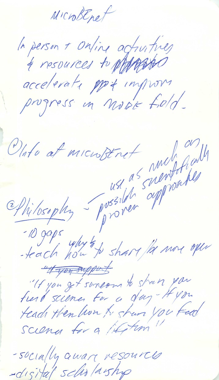I had given this talk for the Annual Sloan Foundation meeting in May of 2013. I had other talks about microBE.net but they were focused on specific aspects and this was my most recent talk on the whole project. And, well, I started doing some minor edits on it, but, well, the slides felt too filled with boring text. And it did not seem to me to capture what I wanted to talk about. So I did the one thing that always helps me in such cases. I shut my computer and got our a notebook and started writing out and drawing out what I really wanted to talk about. And I finally started to have something I liked.