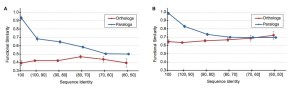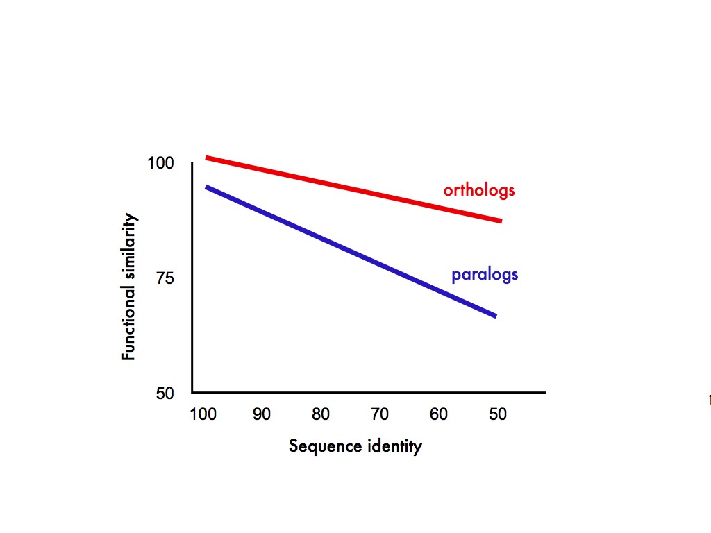 In this completely fictitious graph the relationship between protein function and sequence similarity is a declining one, only it declines faster for paralogs than it does for orthologs. Also, just possibly, gene duplicates start out with slightly diverged function the minute they appear. Anyway, those were our predictions.