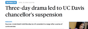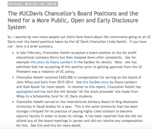 Maybe it is best to start with this. A few weeks ago I was pondering the fate of Chancellor Katehi and I wrote a detailed post about this The #UCDavis Chancellor’s Board Positions and the Need for a More Public, Open and Early Disclosure System.