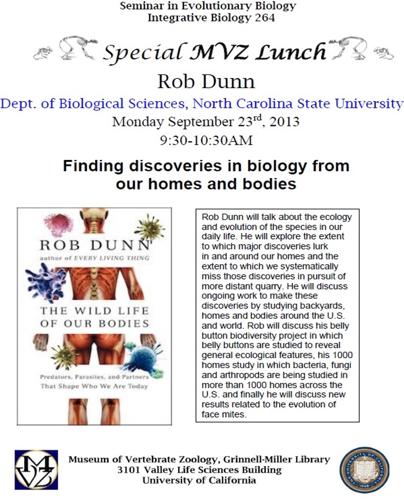 At UC Berkeley 9-23 9:30 AM: Rob Dunn “Finding Discoveries in Biology from Our Homes and Bodies” Share this: Click to share on Bluesky (Opens in new window) Bluesky Click to share on Threads (Opens in new window) Threads Click to share on Mastodon (Opens in new window) Mastodon Click to email a link to a friend (Opens in new window) Email More Click to share on Reddit (Opens in new window) Reddit Share on Tumblr Click to share on WhatsApp (Opens in new window) WhatsApp Post Click to print (Opens in new window) Print PocketLike Loading...