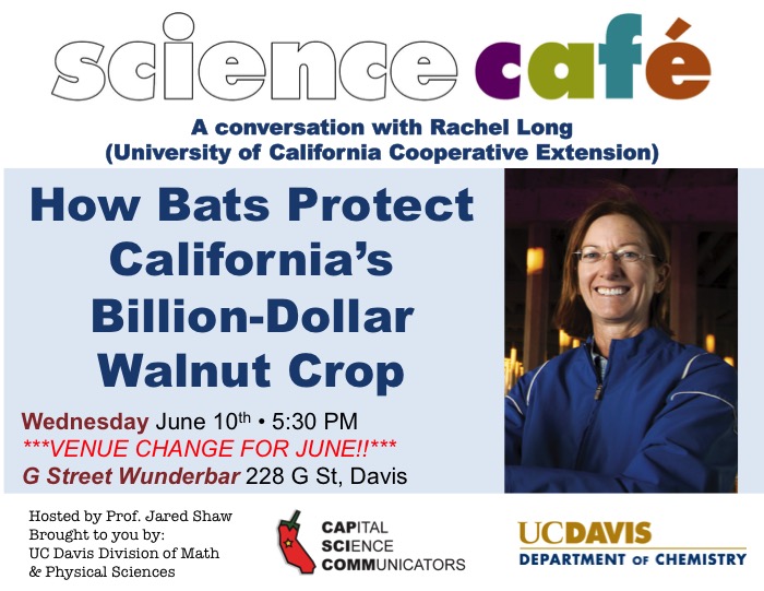 #DavisCA Science Cafe – 6/10 – Bats and Walnuts Share this: Click to share on Bluesky (Opens in new window) Bluesky Click to share on Threads (Opens in new window) Threads Click to share on Mastodon (Opens in new window) Mastodon Click to email a link to a friend (Opens in new window) Email More Click to share on Reddit (Opens in new window) Reddit Share on Tumblr Click to share on WhatsApp (Opens in new window) WhatsApp Post Click to print (Opens in new window) Print PocketLike Loading...